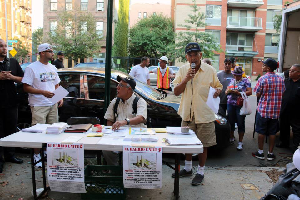 Our campaign to oppose and stop the BDG/ Forest Ratner expansion proposal for East River Plaza has generated an East Harlem following that attracted 175 petitioners to our demonstration of August 28, 2014 at the project site (118th Street and Pleasant Avenue). Various speakers from the neighborhood as well as friendly city wide advocates for low income affordable housing spoke about the issue of exclusionary displacement with the proliferation of high density luxury housing developments into El Barrio. El Barrio Unite takes the position that this particular project requires community support in order to proceed with their NY City Planning Commission application to build three towers 50 stories high because the current zoning laws prohibits this size building. We oppose the 7 amendments to 4 zoning variances this project requires to allow this build which would then impact this community with its immensity. That’s why we have zoning laws which prevent these types of development because it is out of context to the community and can be a civil rights issue.